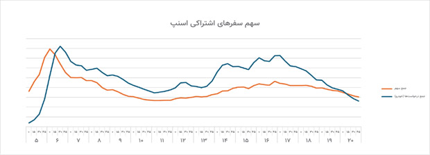 نمودار تجمیعی سهم سفرهای اشتراکی و تعداد کل سفرهای روزانه پایتخت با ناوگان اسنپ